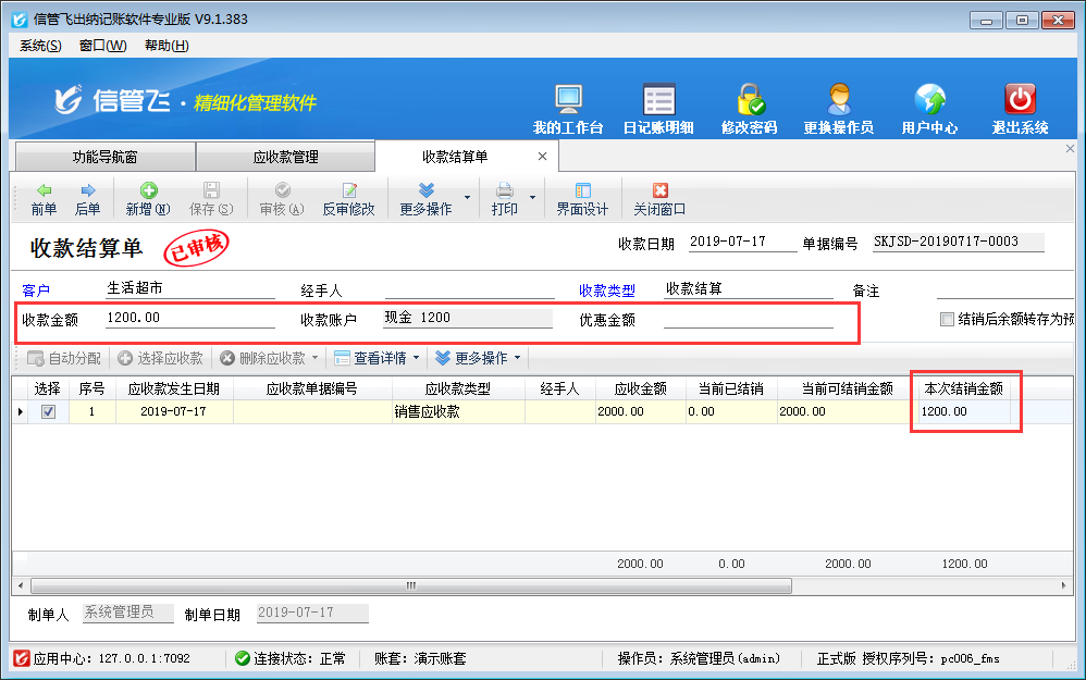在應收款管理界面點擊“收款結算”按鈕可以打開收款結算單對應收款進行收款結算,如下圖所示,在收款結算單單據(jù)主體選擇收款賬戶后錄入“收款金額”1200元,單據(jù)明細中“本次結銷金額”錄入1200元,保存并審核收款結算單即可。