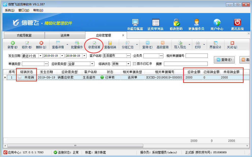 收款結(jié)算單用來登記收款信息(收款對(duì)象即客戶、收款賬戶、收款金額、經(jīng)手人等),并結(jié)銷應(yīng)收款記錄。本篇文章以送貨單打印軟件為例演示一下對(duì)應(yīng)收款進(jìn)行收款結(jié)算的操作步驟。