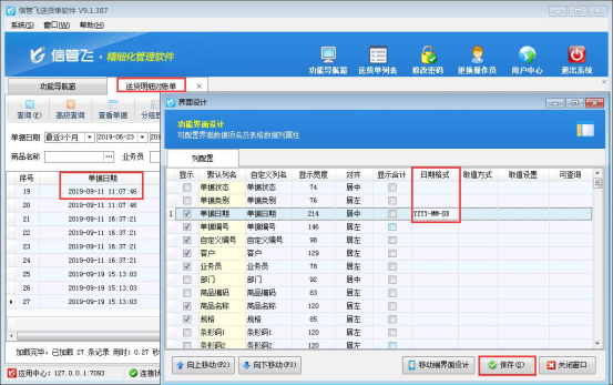 界面設計保存設置好退出,可以看到送貨明細對賬單界面上的單據日期格式不顯示時間,如下圖所示: