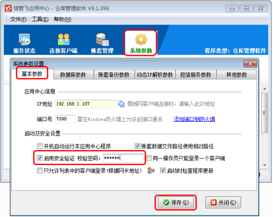 在應用中心界面點擊“系統參數”,在“基本參數”界面打勾選擇“啟用安全驗證”,并輸入校驗密碼進行保存(也可以在菜單中點擊“文件”——》“系統參數設置”進入系統參數設置界面),下圖2為系統參數設置界面。
