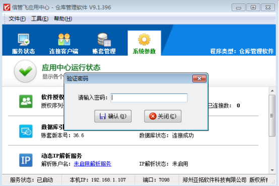 應用中心的管理和配置會對軟件的運行產生重大影響,因此軟件提供增強安全驗證功能,啟用安全驗證后執行賬套管理、系統參數設置等功能時會要求輸入密碼,驗證密碼通過后才可以進行相應操作。下面我們以信管飛倉庫管理軟件應用中心為例詳細介紹下如何啟用安全驗證功能。