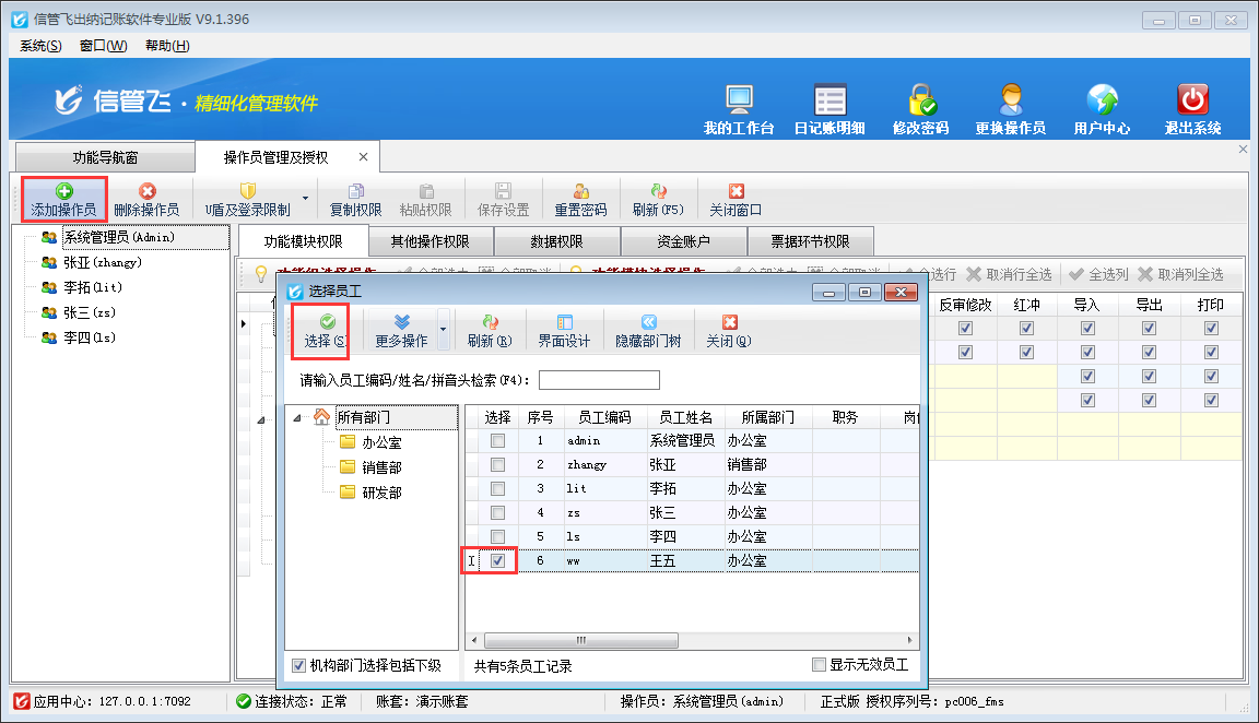 添加操作員:可以將“員工信息”中的員工設(shè)置為操作員,支持批量設(shè)置。點擊“添加操作員”按鈕,然后在打開的“選擇員工”窗口勾選相應(yīng)的員工后點擊“選擇”按鈕添加操作員。
