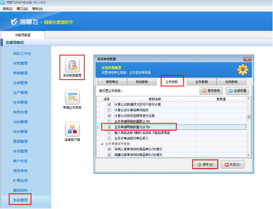 在功能導航窗點擊“系統管理”——》“系統參數配置”——》“業務參數”可以進入到“業務參數”配置界面,在業務單據明細參數內打勾啟用“業務單據明細數量允許為0”參數,如下圖1所示。