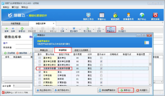 打開(kāi)軟件的“銷售管理”模塊,新開(kāi)一個(gè)銷售出庫(kù)單,在工具欄點(diǎn)擊“界面設(shè)計(jì)”選擇“單據(jù)明細(xì)”項(xiàng),找到“當(dāng)前庫(kù)存數(shù)量”數(shù)據(jù)項(xiàng)并勾選上,保存界面設(shè)計(jì),如下圖所示: