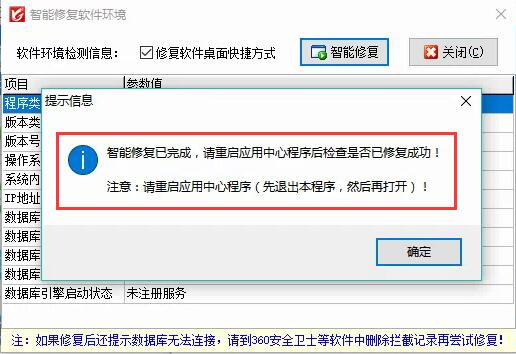 如智能修復(fù)軟件環(huán)境完成后,重啟應(yīng)用中心程序數(shù)據(jù)庫狀態(tài)仍顯示為連接失敗,請(qǐng)聯(lián)系我們?cè)诰客服解決。