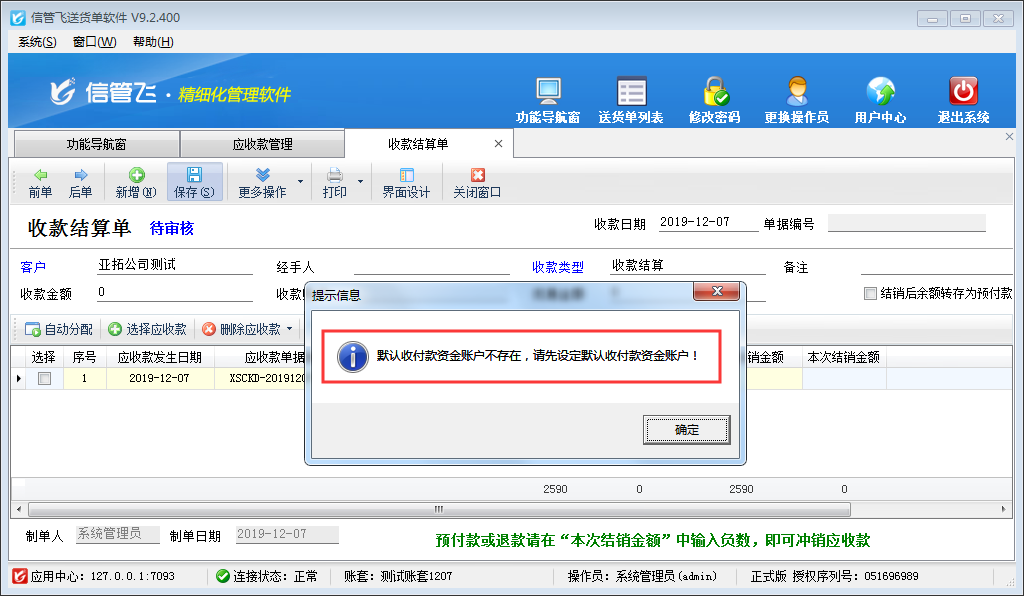 收款結(jié)算單用來登記收款信息(收款對象即客戶、收款賬戶、收款金額、經(jīng)手人等),并結(jié)銷應(yīng)收款記錄。部分用戶在剛開始使用送貨單軟件對軟件功能不熟悉,首次對應(yīng)收款進(jìn)行收款結(jié)算,錄入收款金額時(shí)會提示:默認(rèn)收付款資金賬戶不存在,請先設(shè)定默認(rèn)收付款資金賬戶!(如下圖所示)無法繼續(xù)填開收款結(jié)算單。