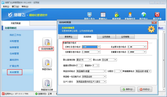 為滿足更多用戶可根據(jù)自身業(yè)務(wù)特點進(jìn)行設(shè)置數(shù)據(jù)格式顯示的需求,信管飛倉庫管理軟件、信管飛送貨單軟件等支持?jǐn)?shù)據(jù)項顯示格式的設(shè)置,以“信管飛倉庫管理軟件”為例,示范如何設(shè)置。登錄軟件,在功能導(dǎo)航窗點“系統(tǒng)管理”—》“系統(tǒng)參數(shù)設(shè)置”即可進(jìn)入“系統(tǒng)參數(shù)設(shè)置”界面,點擊“系統(tǒng)參數(shù)”,如下圖所示:
