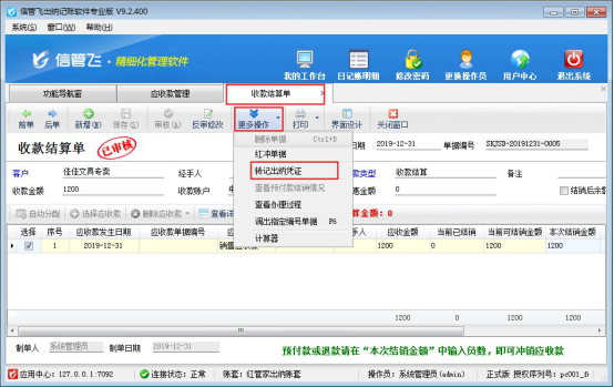 出納記賬軟件支持新增客戶的應(yīng)收款記錄,方便后期對賬。在功能導(dǎo)航窗打開“往來管理”—》“應(yīng)收款管理”,選擇一個未結(jié)銷的應(yīng)收款,點擊工具欄的“收款結(jié)算”按鈕,進入收款結(jié)算單界面。在收款結(jié)算單界面正常進行收款操作,保存或者審核收款結(jié)算單后,在“更多操作”下點擊“轉(zhuǎn)記出納憑證”會彈出出納憑證新增界面,如下圖所示: