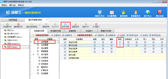 在功能導航窗選擇“系統管理”—》“操作員及授權”—》選擇操作員“王五”,在功能模塊權限中選擇“出納管理”,右側權限設置把現金日記賬和銀行日記賬的可審核權限的勾選符號取消,然后點擊“保存設置”按鈕進行保存權限,如下圖1所示: