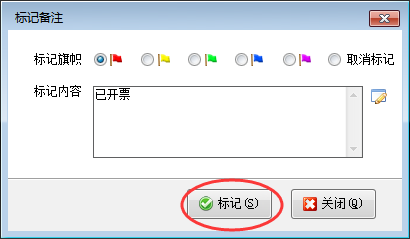 在“標記備注”窗口選擇標記旗幟,錄入標記內容,然后點擊“標記”按鈕即可標記單據備注。