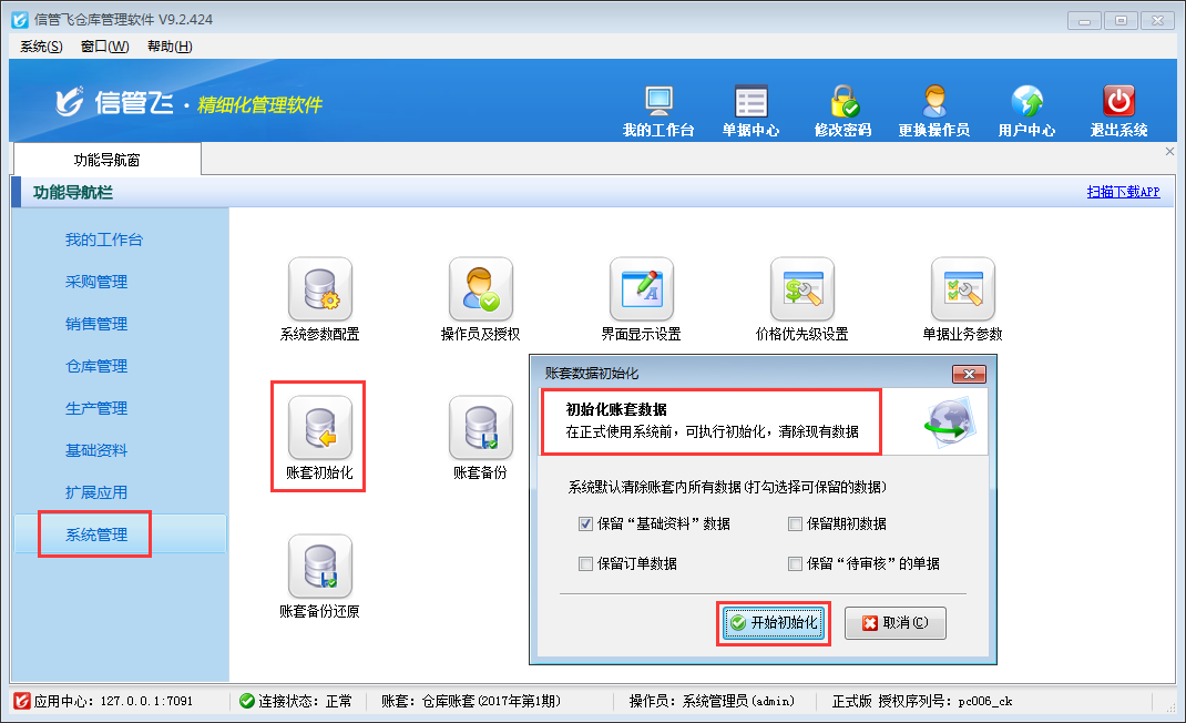執(zhí)行賬套初始化操作后,會刪除賬套內相應的數(shù)據(jù),因此務必提前做好備份,謹慎操作!為了避免操作員誤操作,導致數(shù)據(jù)丟失,軟件內支持設置操作員不可進行賬套初始化操作,下面以信管飛倉庫管理軟件為例來演示一下具體的操作步驟。