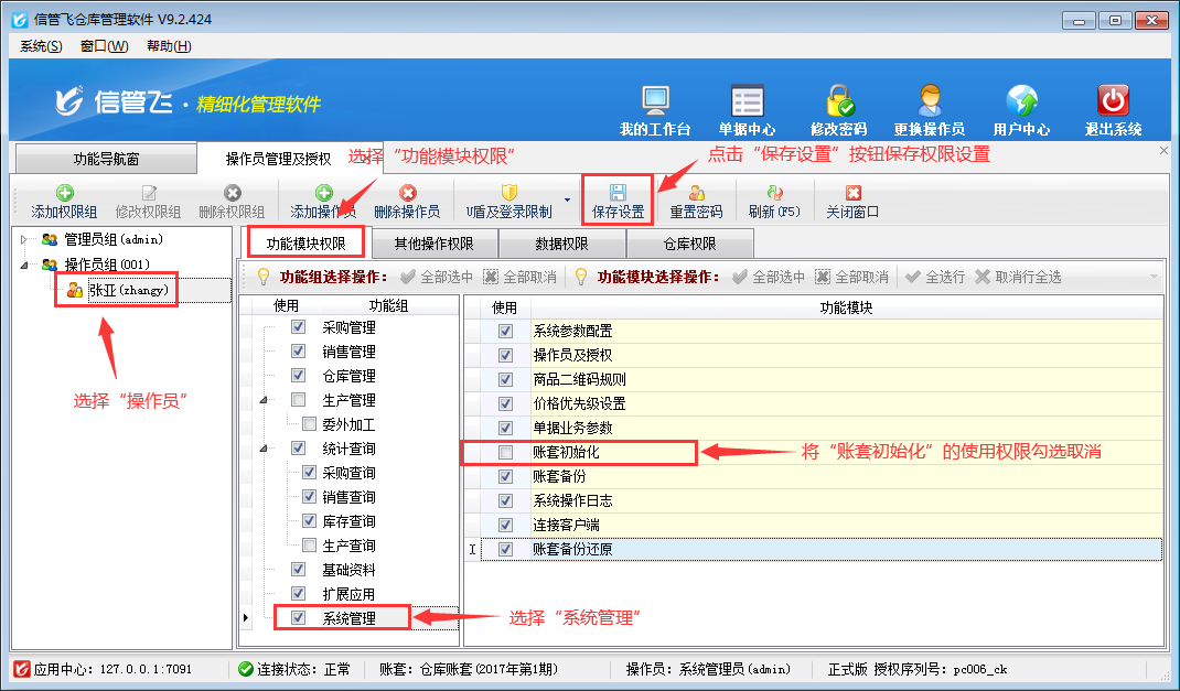 登錄軟件,在功能導航窗點擊“系統(tǒng)管理”—》“操作員及授權”,進入“操作員管理及授權”界面,選擇操作員“張亞”,在其右側的功能模塊權限內選擇“系統(tǒng)管理”模塊,將賬套初始化的“使用”權限勾選取消,然后保存設置,如下圖所示。