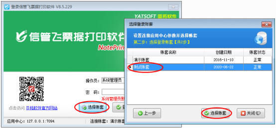 運行信管飛票據(jù)打印軟件客戶端(藍色圖標),在軟件登錄界面點擊“選擇賬套”,在“選擇登錄賬套”界面選擇我們所需要的賬套,然后登錄軟件即可。
