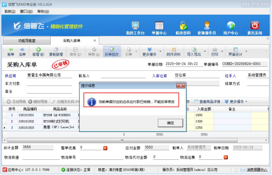 亞拓軟件自主開(kāi)發(fā)的信管飛RMS軟件支持將采購(gòu)入庫(kù)單進(jìn)行付款結(jié)銷(xiāo)操作,有時(shí)可能存在采購(gòu)單商品明細(xì)開(kāi)錯(cuò)的情況。如果當(dāng)前采購(gòu)入庫(kù)單的應(yīng)付款已結(jié)銷(xiāo),軟件是不允許再修改此單據(jù)的,如下圖所示: