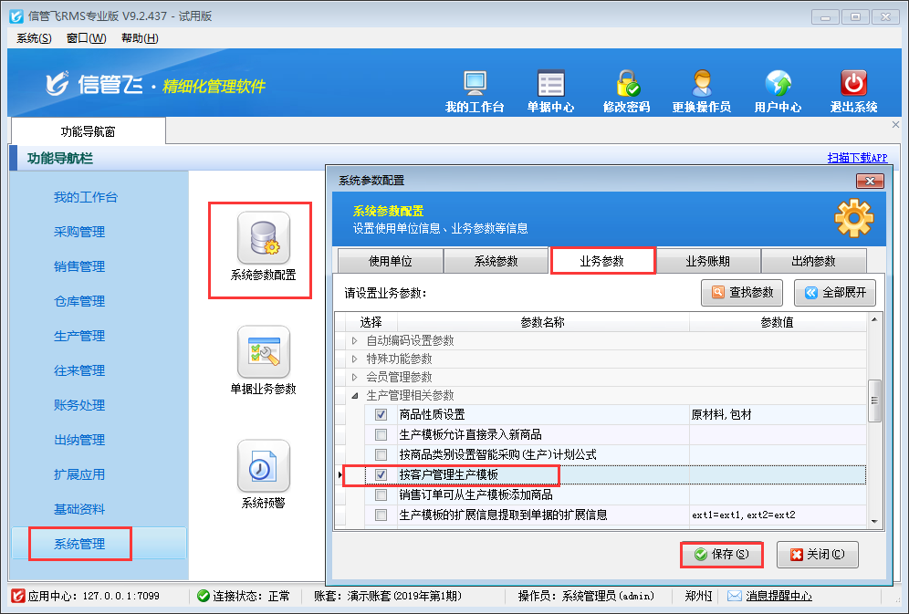 在功能導航窗點擊“系統(tǒng)管理”—》“系統(tǒng)參數(shù)配置”—》“業(yè)務參數(shù)”打開業(yè)務參數(shù)配置界面,然后在生產(chǎn)管理相關參數(shù)中打鉤啟用“按客戶管理生產(chǎn)模板”參數(shù),然后點擊“保存”按鈕保存參數(shù)配置,如下圖所示。