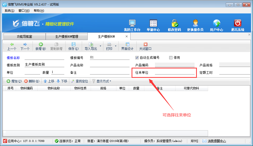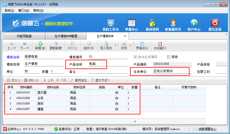 參數(shù)配置完成之后,打開生產(chǎn)管理模塊,重新新增生產(chǎn)模板BOM表時,即可選擇往來單位,如下圖所示,在給“亞拓公司測試”、“藍貓文具店”兩家客戶生產(chǎn)同樣的產(chǎn)品“電腦”時設置的不同的生產(chǎn)模板,所需的原材料不同。