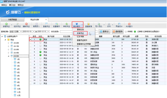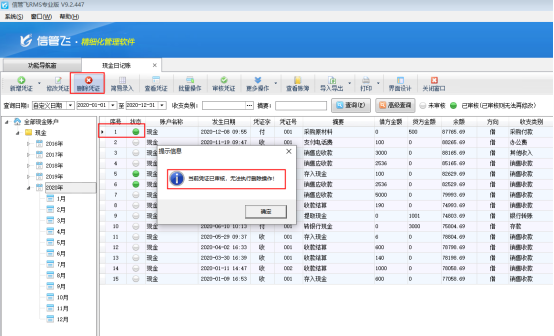 信管飛RMS標準版和專業版都包括登記出納日記賬憑證功能,在新增保存日記賬憑證后都可以直接審核憑證,憑證審核后,不允許直接刪除。客戶如果需要刪除已審核的憑證,需要先反審憑證,再進行刪除。下面我們介紹一下在信管飛RMS專業版中如何刪除已審核的日記賬憑證?