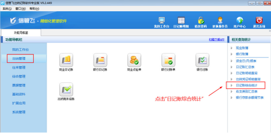 然后在“出納管理”模塊最右側的“相關查詢統計”內點擊“日記賬綜合統計”,如圖2所示,系統打開“日記賬綜合統計”界面,如圖3所示。
