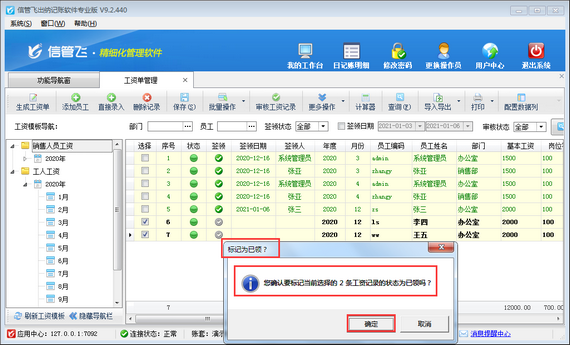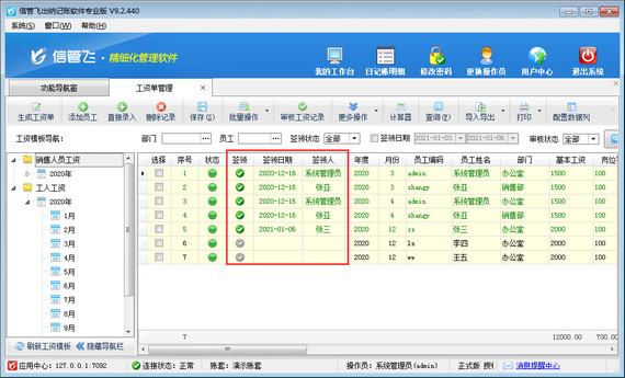 信管飛出納記賬軟件專業(yè)版包括工資管理功能,支持自定義工資模板,可根據(jù)設(shè)置的工資模板快速生成工資單,支持從上月工資單復(fù)制工資項(xiàng)目數(shù)據(jù),每月工資發(fā)放后,可將工資記錄標(biāo)記為簽領(lǐng)狀態(tài),如下圖所示,本文介紹一下出納記賬軟件中如何標(biāo)記工資記錄為已簽領(lǐng)狀態(tài)?