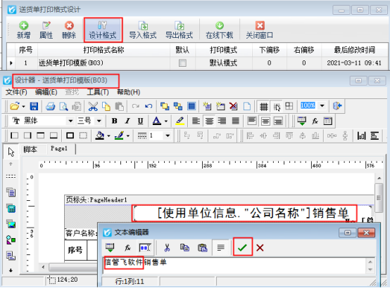 需要打印另外一個(gè)單位名稱“信管飛軟件”,首先需要復(fù)制一份相同打印格式,在開單界面打印按鈕下點(diǎn)擊“打印格式設(shè)計(jì)”,在打印格式設(shè)計(jì)界面可通過導(dǎo)出導(dǎo)入方式,導(dǎo)入一個(gè)和默認(rèn)模板一樣的打印格式,選擇導(dǎo)入的打印格式點(diǎn)擊“設(shè)計(jì)格式”進(jìn)入模板設(shè)計(jì)器界面,在模板設(shè)計(jì)器界面。雙擊打開抬頭的文本框,修改名稱為“信管飛軟件”后確定保存。如下圖所示: