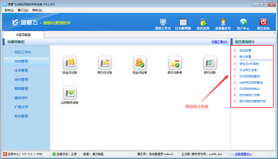 操作員權限設置完成后,使用操作員“張亞”登錄軟件,打開出納管理模塊,查看相關查詢統計報表,可以看到操作員賬號已無法查看到“資金日(月)報表”。