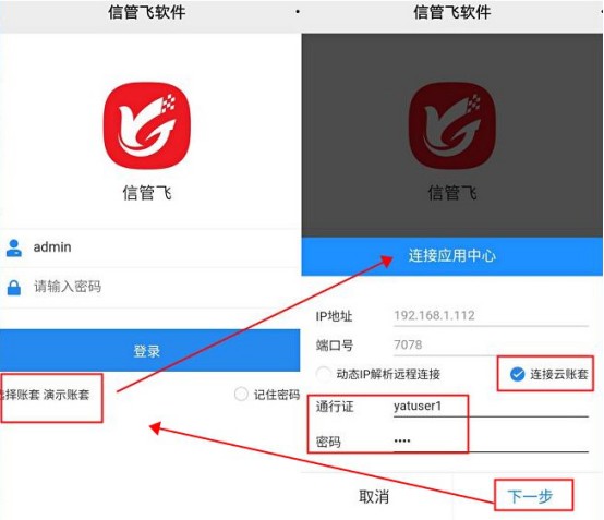 在彈出的登錄界面。點擊選擇賬套,勾選動態ip解析遠程連接或連接云賬套,輸入購買后分配的解析賬號和密碼或通行證和密碼。點擊下一步,進入選擇賬套界面。選擇下賬套,點擊選擇賬套,進入登錄窗口,默認登錄操作員是:admin(系統管理員),密碼為自己設置的密碼(如沒有密碼,直接點擊登錄)。如需其他操作員登錄,可電腦端員工信息中查看員工對應的員工編碼,輸入此信息登錄。如下圖所示: