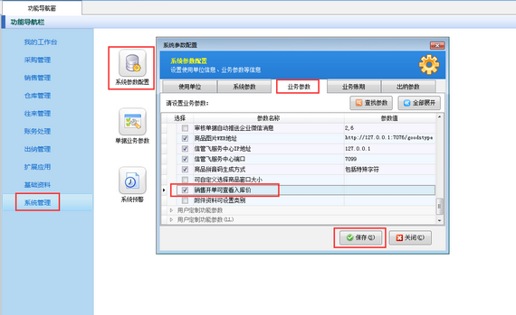 在功能導航窗點擊“系統(tǒng)管理”—》“系統(tǒng)參數(shù)設置”—》“業(yè)務參數(shù)”打開業(yè)務參數(shù)配置界面,如下圖所示,在特殊功能參數(shù)中找到“銷售開單可查看入庫價”參數(shù),勾選啟用此參數(shù),然后點擊“保存”按鈕保存參數(shù)配置。