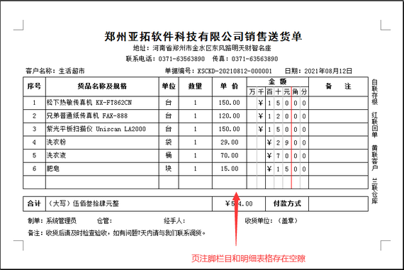 本篇文章以送貨單軟件為例介紹一下,打印格式模板中頁注腳和明細(xì)表格有空隙的情況下,如何處理?