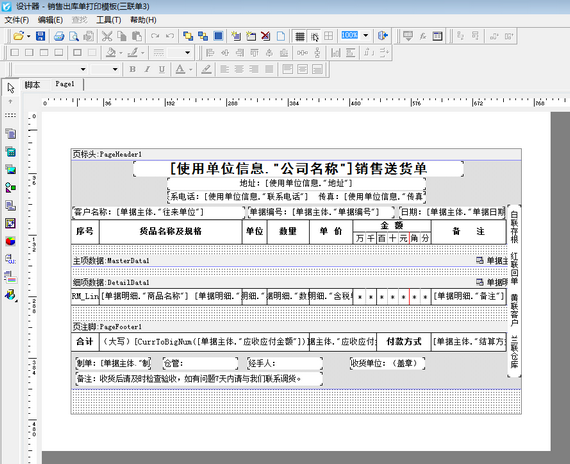 打開一個已保存的送貨單,然后在單據(jù)界面點(diǎn)擊“打印”—“打印格式設(shè)計”按鈕,進(jìn)入“送貨單打印格式設(shè)計”界面,以內(nèi)置模板銷售出庫單打印模板(三聯(lián)單3)為例,選擇此打印格式模版,然后點(diǎn)擊“設(shè)計格式”按鈕進(jìn)入模版設(shè)計器界面,如下圖所示。