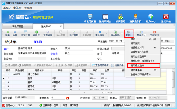 在功能導(dǎo)航窗點擊“新開送貨單”,新增保存一個單據(jù),在打印按鈕下點擊打印格式設(shè)計,可進入打印格式設(shè)計界面。如下圖所示: