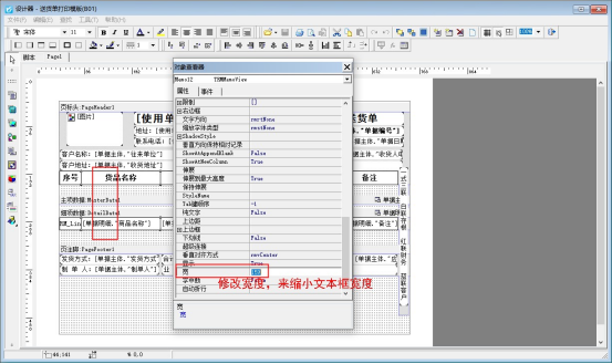 如何在打印模板上加上此列?打印模板格式因為尺寸固定,需要增加新的明細列,要先縮小其他文本框的寬度。在開單界面打印下選擇打印格式設(shè)計,打印格式設(shè)計界面點擊“設(shè)計格式”,進入模板設(shè)計器界面,選擇需要縮短寬度的文本框,鼠標左鍵單擊選擇文本框(需要多選可按著shift鍵鼠標分別單擊,可同時修改兩個文本框),下一步鼠標右鍵,選擇屬性,打開“對象查看器”找到寬度,修改寬度,enter鍵確認,然后關(guān)閉“對象查看器”可看到文本框按寬度修改,如下圖所示: