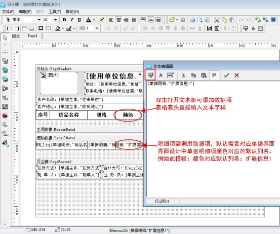 文本框添加完成后,雙擊打開文本框進行添加數(shù)據(jù),表頭文本框打開輸入文字“顏色”,明細項文本框調(diào)用數(shù)據(jù)項“[單據(jù)明細."擴展信息1"]”,如下圖所示: