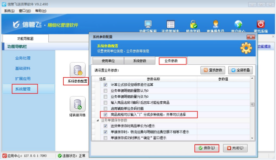 在功能導(dǎo)航窗點(diǎn)擊“系統(tǒng)管理”—》“系統(tǒng)參數(shù)配置”,勾選啟用“業(yè)務(wù)參數(shù)”中的“商品規(guī)格可以輸入”|“分成多種規(guī)格,開(kāi)單可以選擇”參數(shù)。如下圖所示:
