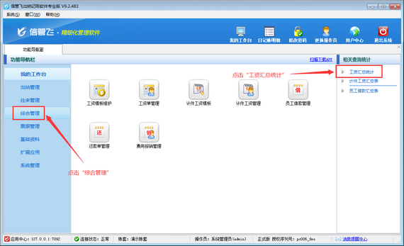 在功能導(dǎo)航窗點(diǎn)擊“綜合管理”—》“工資匯總統(tǒng)計”即可進(jìn)入工資匯總統(tǒng)計表界面,如下圖所示。