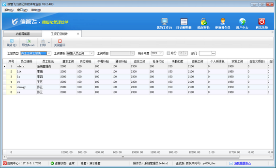 出納記賬軟件支持工資管理功能,支持自定義工資模板管理員工工資單,可根據(jù)設(shè)置的工資模板快速生成員工工資單,提高了企業(yè)管理效率。工資匯總統(tǒng)計可根據(jù)匯總類型、工資模板、工資項目、統(tǒng)計年度、月份等條件來進(jìn)行統(tǒng)計所有員工的工資情況,包括員工姓名、基本工資、應(yīng)發(fā)工資等數(shù)據(jù),本文詳細(xì)介紹一下如何查詢員工工資匯總表?