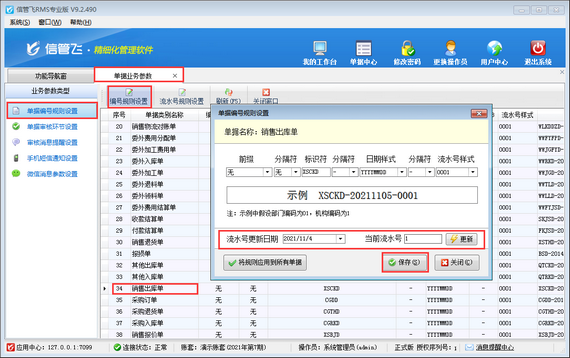 “單據(jù)編號規(guī)則設置”界面,找到“銷售出庫單”項,點擊“編號規(guī)則設置”進行設置。其中“流水號更新日期”修改為2021年11月4日,“當前流水號”修改為1(要補錄0002單號,所以當前已存在的流水號是1),點擊“更新”,最后保存一下。如下圖所示:
