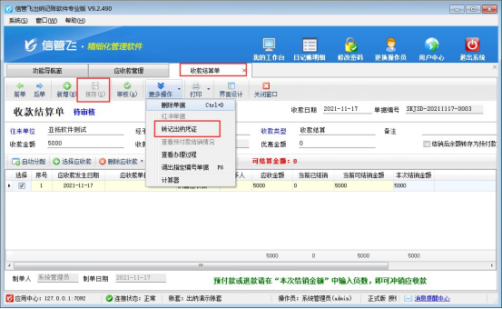 參數啟用完成后,在“往來管理”中打開應收款管理,選擇狀態為“未結銷”的應收款記錄,點擊收款結算,在彈出的結算單界面上,正常結算應收款,保存結算單后在“更多操作”下點擊“轉記出納憑證”(需要自動提醒轉記可參考此文章設置:出納軟件如何設置結算單保存或審核時提醒轉記日記賬?),如下圖所示: