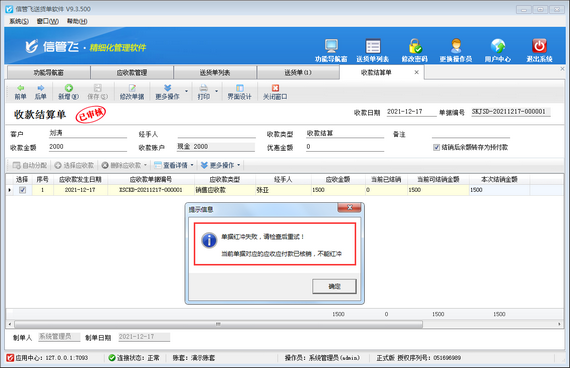 應(yīng)收、應(yīng)付賬款管理是現(xiàn)代企業(yè)資金管理的重要組成部分,其管理效果的好壞直接影響到企業(yè)經(jīng)營的成敗,信管飛RMS、信管飛出納記賬軟件及信管飛送貨單軟件均支持管理往來賬款,如果應(yīng)收款結(jié)銷后發(fā)現(xiàn)收款結(jié)銷錯誤,系統(tǒng)支持紅沖并刪除收款記錄,部分用戶在紅沖收款結(jié)算單時會出現(xiàn)如下圖提示:收款結(jié)算單紅沖失敗,當前單據(jù)對應(yīng)的應(yīng)收應(yīng)付款已結(jié)銷,不能紅沖!