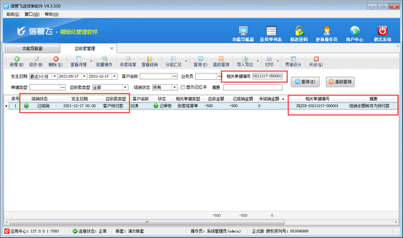根據(jù)圖中顯示,此收款結(jié)算單單據(jù)編號為“SKJSD-20211217-000001”,然后打開應(yīng)收款管理界面,在相關(guān)單據(jù)編號處輸入此收款結(jié)算單單據(jù)編號“SKJSD-20211217-000001”,即可查詢到此收款結(jié)算單結(jié)銷余額轉(zhuǎn)存生成的客戶預(yù)付款記錄,如下圖所示。