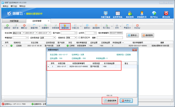 然后,選中此已結(jié)銷的客戶預(yù)付款記錄,在工具欄點擊“查看結(jié)銷”—》“查看結(jié)算單”,打開此客戶預(yù)付款的結(jié)銷記錄,將此客戶預(yù)付款結(jié)銷記錄先紅沖刪除后,單據(jù)編號為“SKJSD-20211217-000001”的收款結(jié)算單即可紅沖刪除成功,如下圖所示。