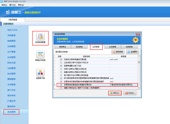 系統(tǒng)默認(rèn)發(fā)票保存時(shí)更新業(yè)務(wù)單據(jù)的開票狀態(tài),如需設(shè)置發(fā)票審核后更新業(yè)務(wù)單據(jù)的開票狀態(tài),可在功能導(dǎo)航窗點(diǎn)擊“系統(tǒng)管理”—》“系統(tǒng)參數(shù)設(shè)置”—》“業(yè)務(wù)參數(shù)”中找到并啟用參數(shù)“發(fā)票審核時(shí)更新相關(guān)單據(jù)的開票狀態(tài)”(不啟用則發(fā)票保存時(shí)更新相關(guān)單據(jù)的開票狀態(tài)),如下圖所示。