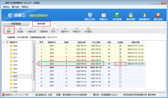 在功能導(dǎo)航窗點擊“基礎(chǔ)資料”—》“期末結(jié)賬”,進入期末結(jié)賬界面,本文示例鎖定2022年6月份的單據(jù),在期末結(jié)賬界面,選擇賬期年份2022年6月,工具欄點擊“結(jié)賬”按鈕進行操作結(jié)賬,結(jié)賬完成后,已結(jié)賬處顯示已勾選,賬期進入2022年7月份,如下圖所示: