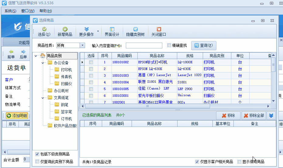 信管飛送貨單軟件開送貨單前可提前添加好商品信息到基礎(chǔ)資料中,新開送貨單選擇客戶后,選擇“添加明細(xì)”可彈出選擇商品界面,可選擇添加好的商品信息,有用戶反映在選擇商品界面,查詢窗口輸入商品簡(jiǎn)寫不自動(dòng)過濾,需要點(diǎn)擊下查詢才會(huì)進(jìn)行檢索,如下圖所示: