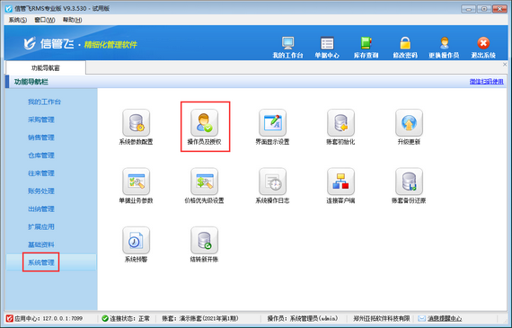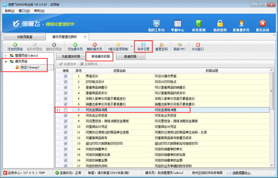 在功能導航窗點擊“系統(tǒng)管理”—》“操作員及授權”,可進入“操作員管理及授權”界面,選中操作員賬號,在“其他操作權限”界面將“可發(fā)送微信消息”權限打鉤取消,然后保存權限設置,如下圖所示,設置操作員“張亞”沒有“可發(fā)送微信消息”權限。