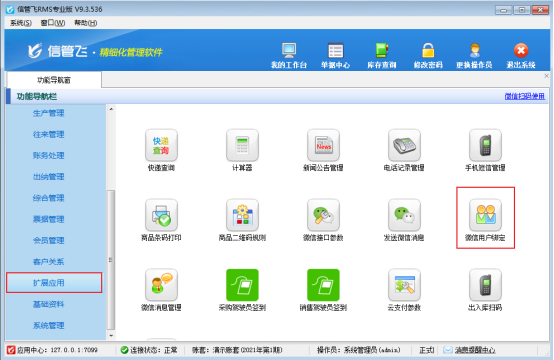 在功能導(dǎo)航窗點擊“擴(kuò)展應(yīng)用”—》“微信用戶綁定”,可進(jìn)入“微信用戶綁定管理”界面,選中已綁定的微信客戶,在“綁定操作”下取消綁定,即取消對客戶的綁定如圖所示。