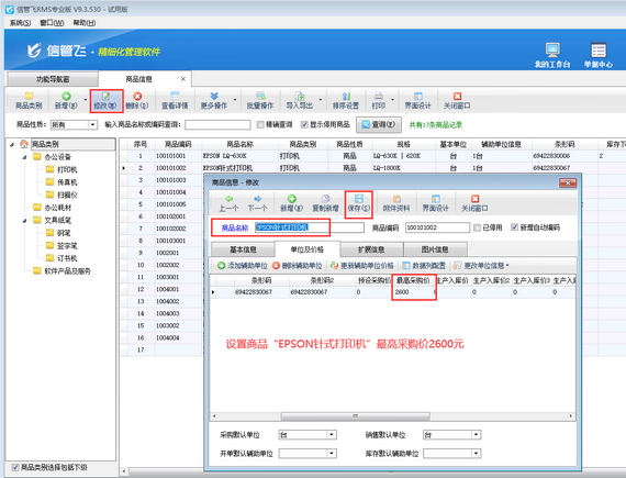 在功能導航窗點擊“基礎資料”—》“商品信息”即可打開“商品信息”界面,然后選擇商品,點擊“修改”按鈕,在“單位及價格”標簽頁可設置商品“最高采購價”,如下圖所示,設置商品“EPSON針式打印機”最高采購價為2600元。