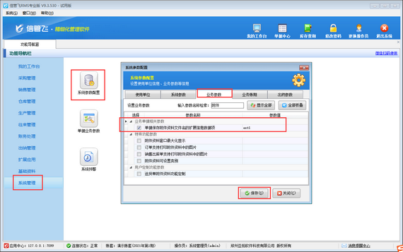 在功能導航窗點擊“系統管理”—》“系統參數配置”—》“業務參數”打開業務參數配置界面,在“業務單據相關參數”內啟用參數“單據保存附件資料文件名的擴展信息數據項”,并設置參數值,默認是“ext1”(單據主體.擴展信息1)。