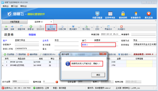 以送貨單軟件為例,示范下如何設(shè)置開單收貨人允許為空。送貨單界面設(shè)置收貨人是必填項,正常開送貨單,未在單據(jù)主體中輸入“收貨人”,商品輸入完成后點擊確認開單按鈕,會提示“收貨人不能為空”,如下圖1所示: