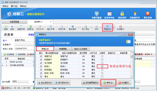 在送貨單開單界面—》界面設(shè)計,單據(jù)主體,在必填項找到“收貨人”數(shù)據(jù)項,把必填項的勾選符號去掉,然后保存,如圖2所示: