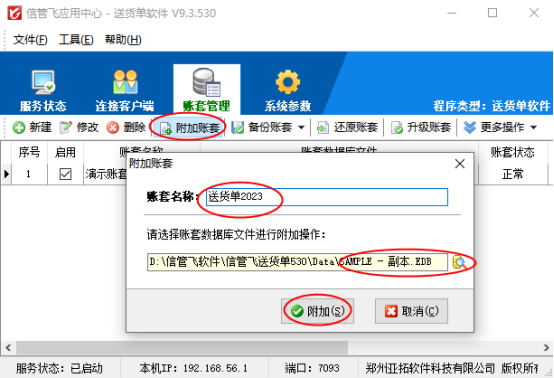 復(fù)制賬套完成后打開應(yīng)用中心程序賬套管理界面,點擊“附加賬套”,選擇源文件副本進行附加,附加后可修改賬套名稱,示例賬套修改為:送貨單2023,如下圖所示: